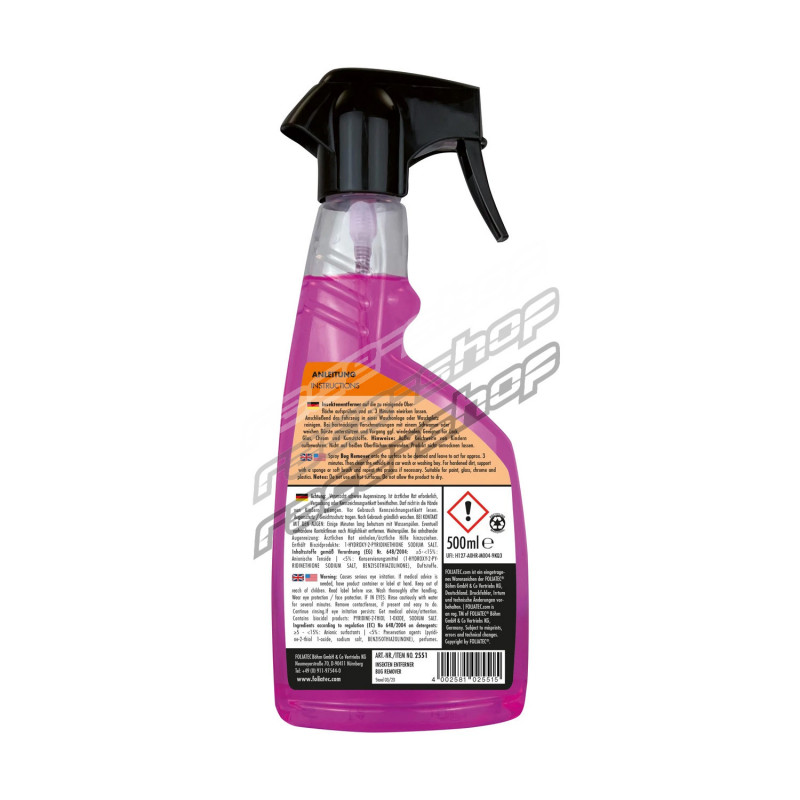 velmi jednoduchý na použití. Stačí ho nastříkat, nechat působit a setřít. - a zbytky hmyzu a nečistoty jsou odstraněny z vašeho auta. Je vhodný pro všechny druhy povrchů včetně laku, chromu a plastů. Je taky bezpečný pro všechny autofólie Neobsahuje žádné agresivní chemické látky, které by mohly být škodlivé pro životní prostředí. Můžete si být jisti, že náš produkt je nejen účinný, ale i bezpečnýPoužití: