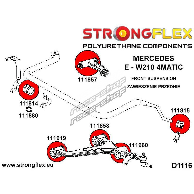 Před objednáním zkontrolujte průměr protiprokluzové tyče a typ pouzdra ve vašem voze. Model E-W210 má dvě přední anti roll bar pouzdra, 111814 nebo 111880.